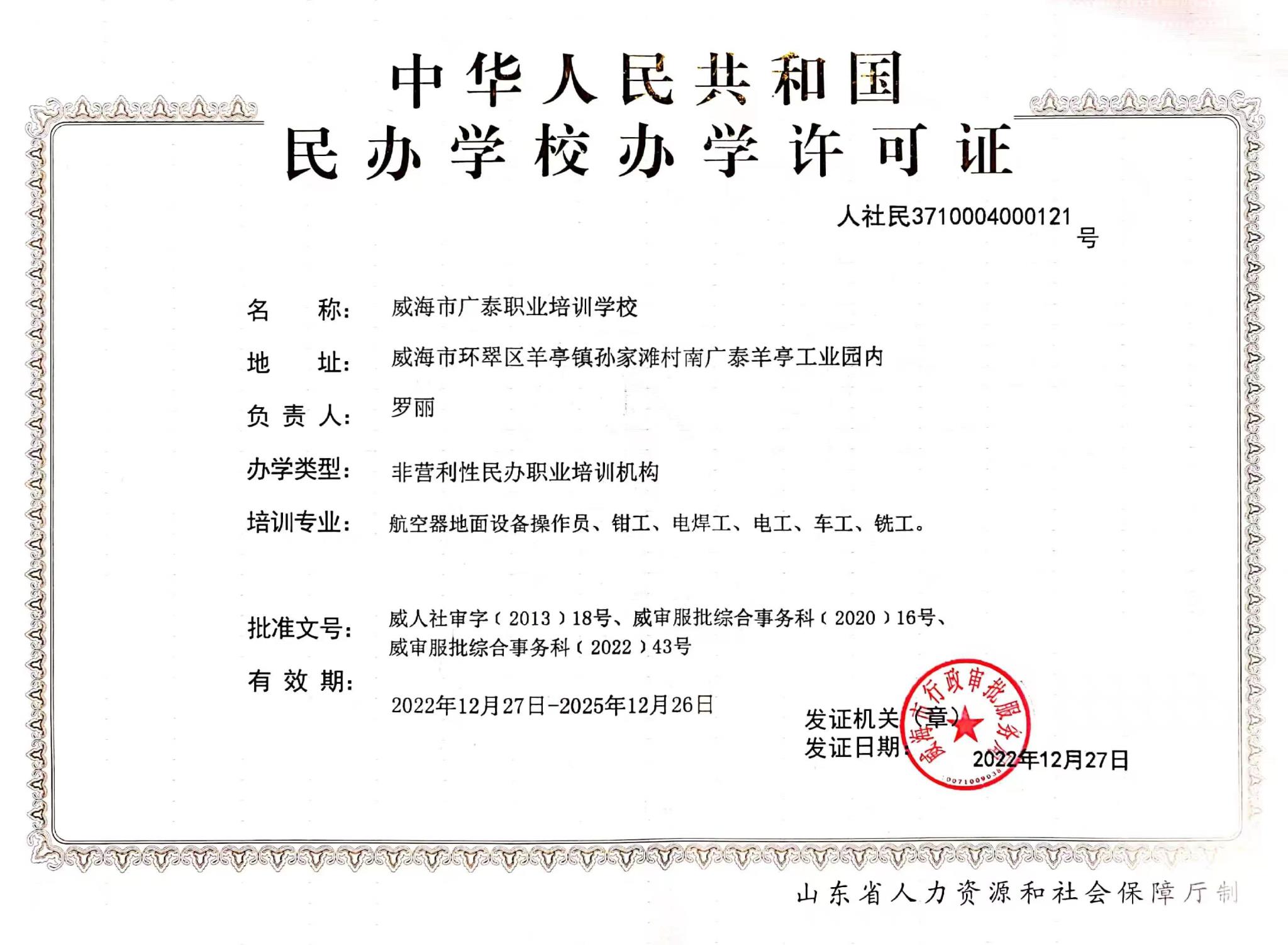 威海廣泰職業(yè)培訓學校成立于2013年,由威海廣泰空港設備股份有限公司全資設立。 學校位于威海市環(huán)翠區(qū)羊亭鎮(zhèn)惠河路93號,是經(jīng)威海市人力資源和社會保障局批準成立的職業(yè)培訓機構,具有民航特種車輛操作工、民航特種車輛機械維修工、民航特種車輛電氣維修工、鉗工、電工、焊工、車工、銑工、涂裝工、計算機操作員等工種的初、中、高級職業(yè)技能培訓資質(zhì)。學校致力于成為民航業(yè)內(nèi)專業(yè)的技能提升培訓服務機構,堅持“教練結合、寓教于練”的培訓理念,為學員提供優(yōu)質(zhì)的培訓服務。